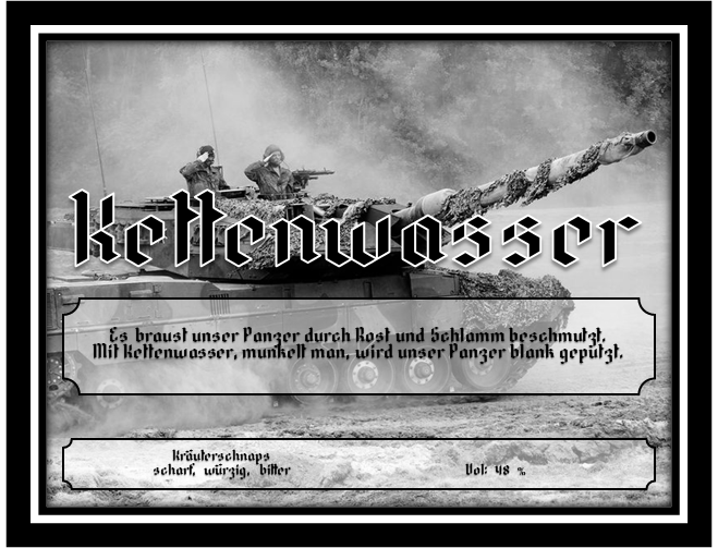 Seinen Ursprung hat Kettenwasser bei der Bundeswehr, wo man in der Panzertruppe in der Lüneburger Heide einst munkelte, dass Kettenwasser so unangenehm sei, dass man damit bei den Ketten des Kampfpanzers das Chrom wieder zum Vorschein bringen könnte (abbeizen).